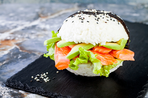 The sushi burger is structured like a normal burger. The difference is that the filling is pressed between two slices of rice. In between, there are usually typical sushi fillings such as raw fish or soft-shell crabs, but also beef and toppings such as avocado, spicy mayo, and pickled ginger.
